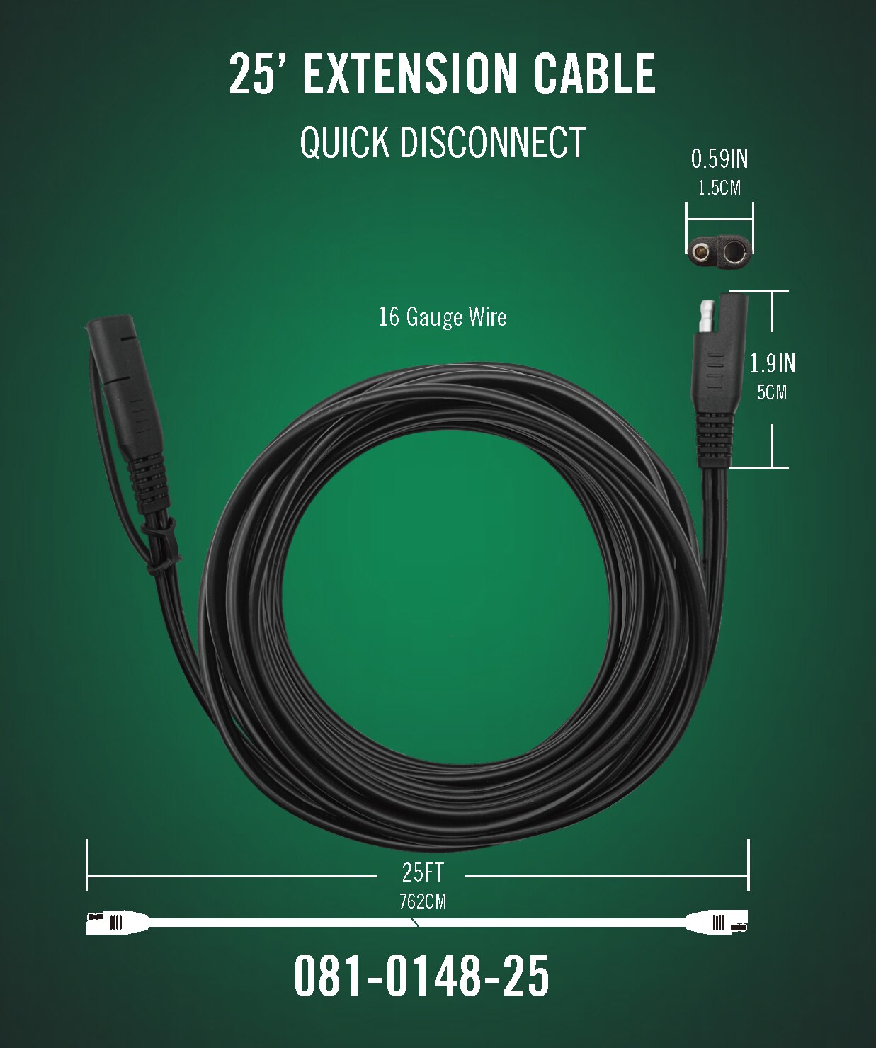 This lead extension cable will extend the reach of your Battery Tender Charger by 25 feet; also available in 6 foot (081-0148-6) and 12 foot (081-0148-12) lengths