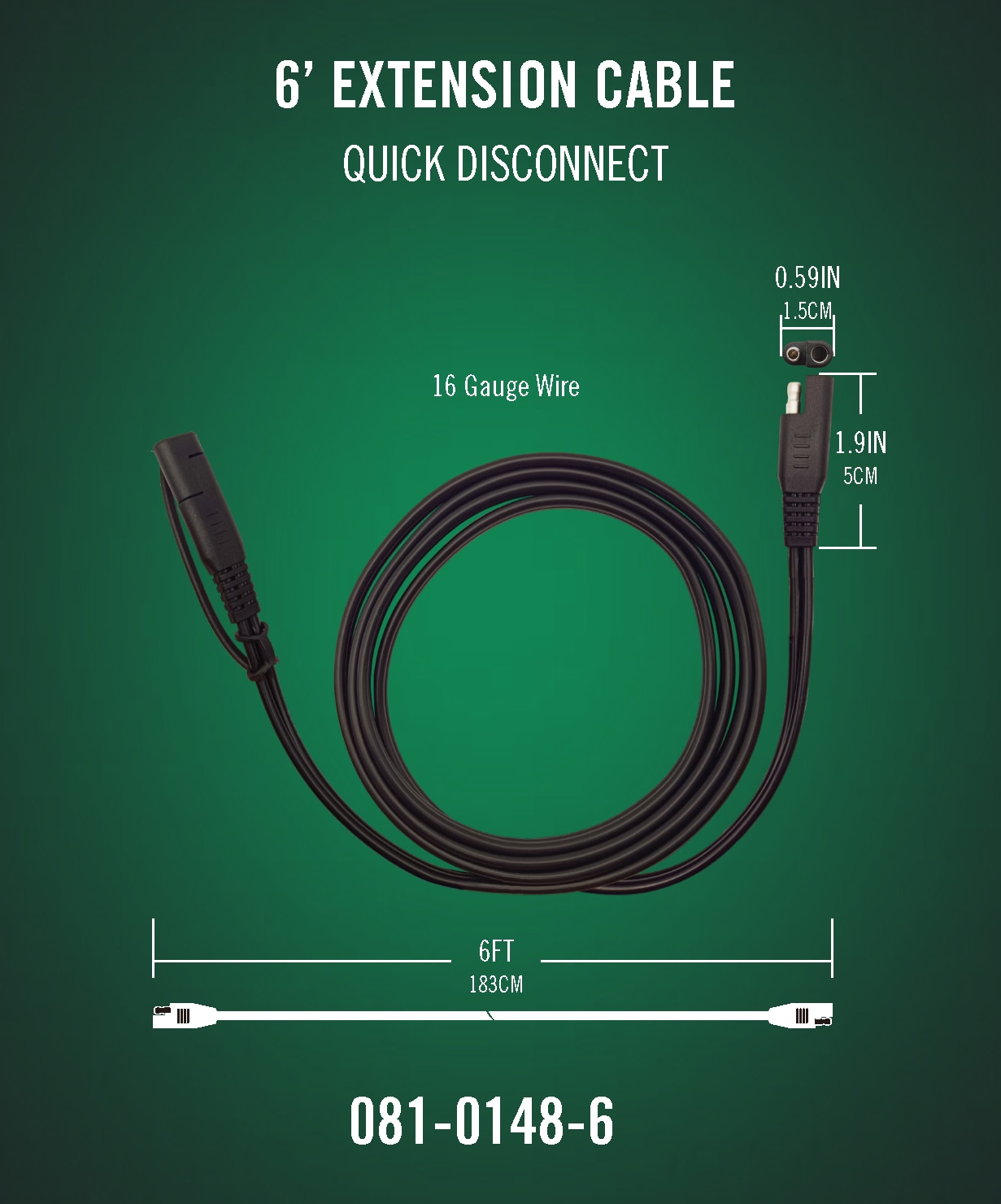 If you have multiple vehicles to charge at once, Battery Tender extension cables are also available in 12 foot extension packs of 4 (081-0148-12-BG4). Multipacks not available in 6 foot variant